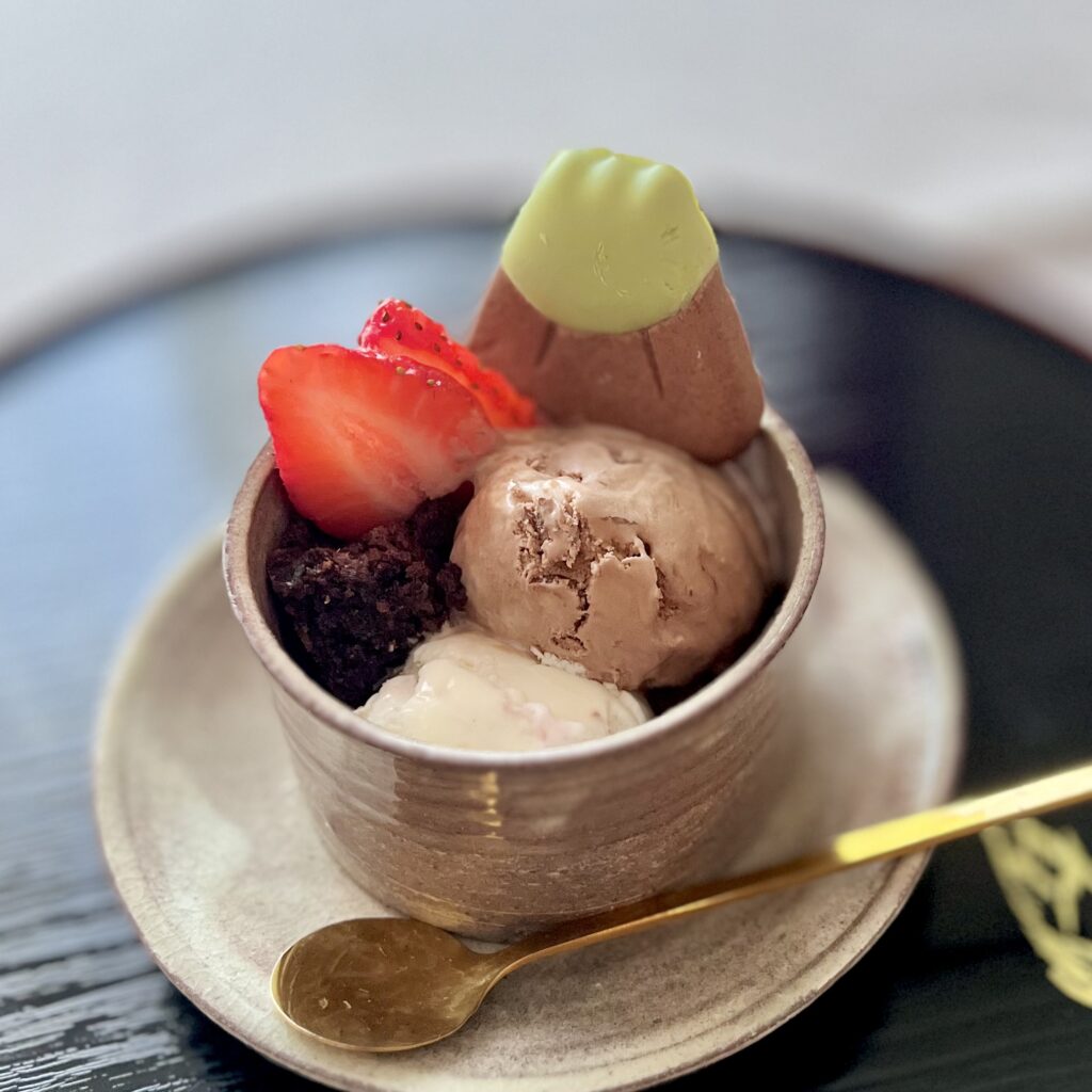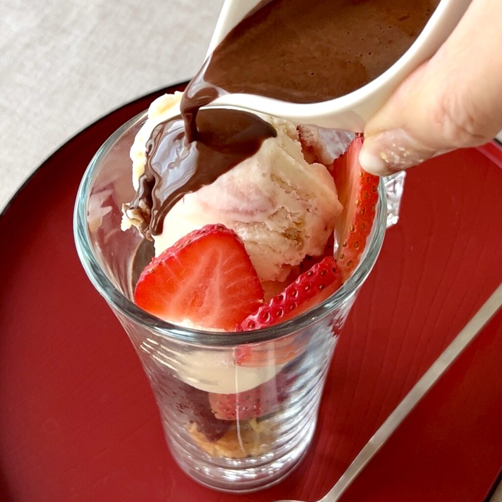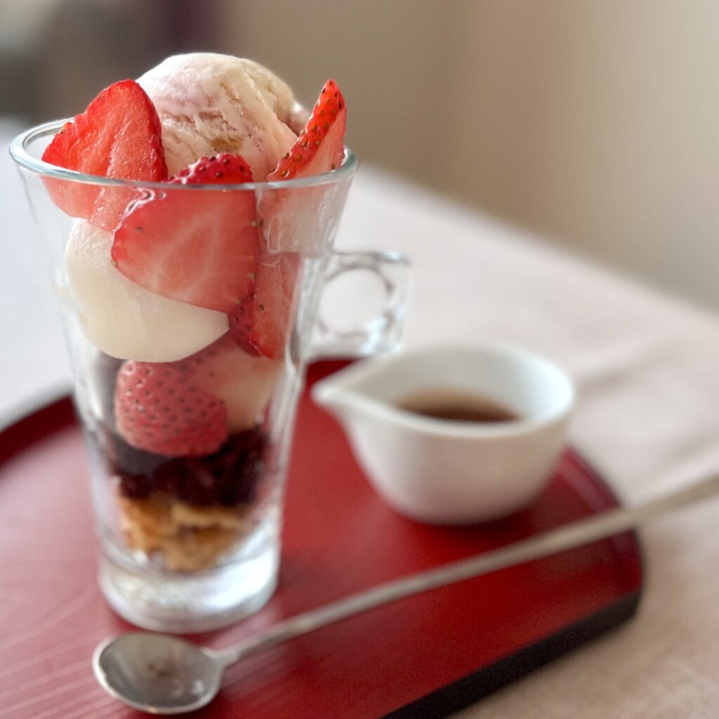 飲み込むタイミングがよく分からない、という理由でお餅が苦手なオットは、アイス2種類でミニパフェ。