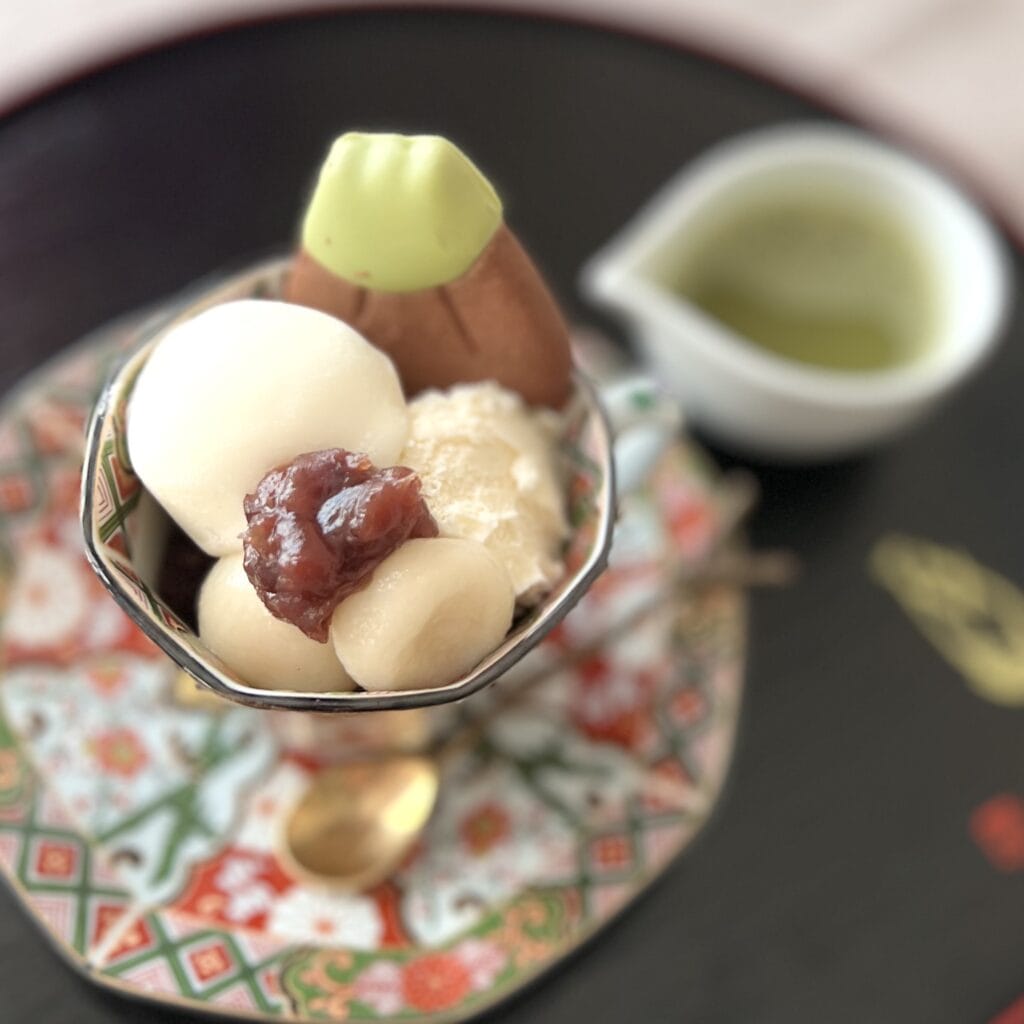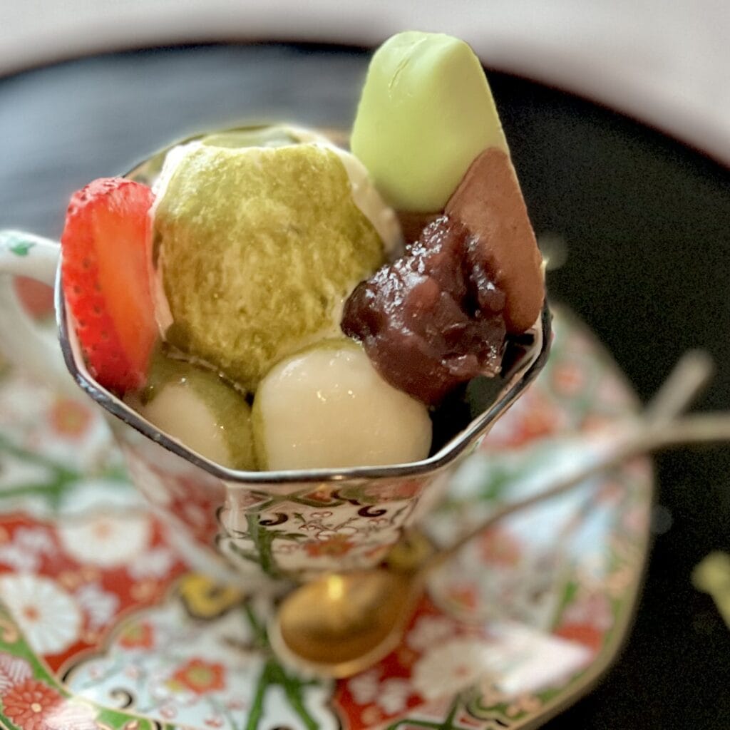 白玉、雪見だいふく、あんこ、バニラアイス、富士山シェイプの抹茶クッキー。あ、いちご忘れた