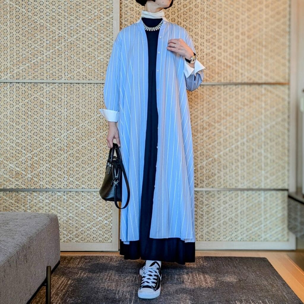 ①水色ストライプのシャツワンピで爽やかレイヤード
