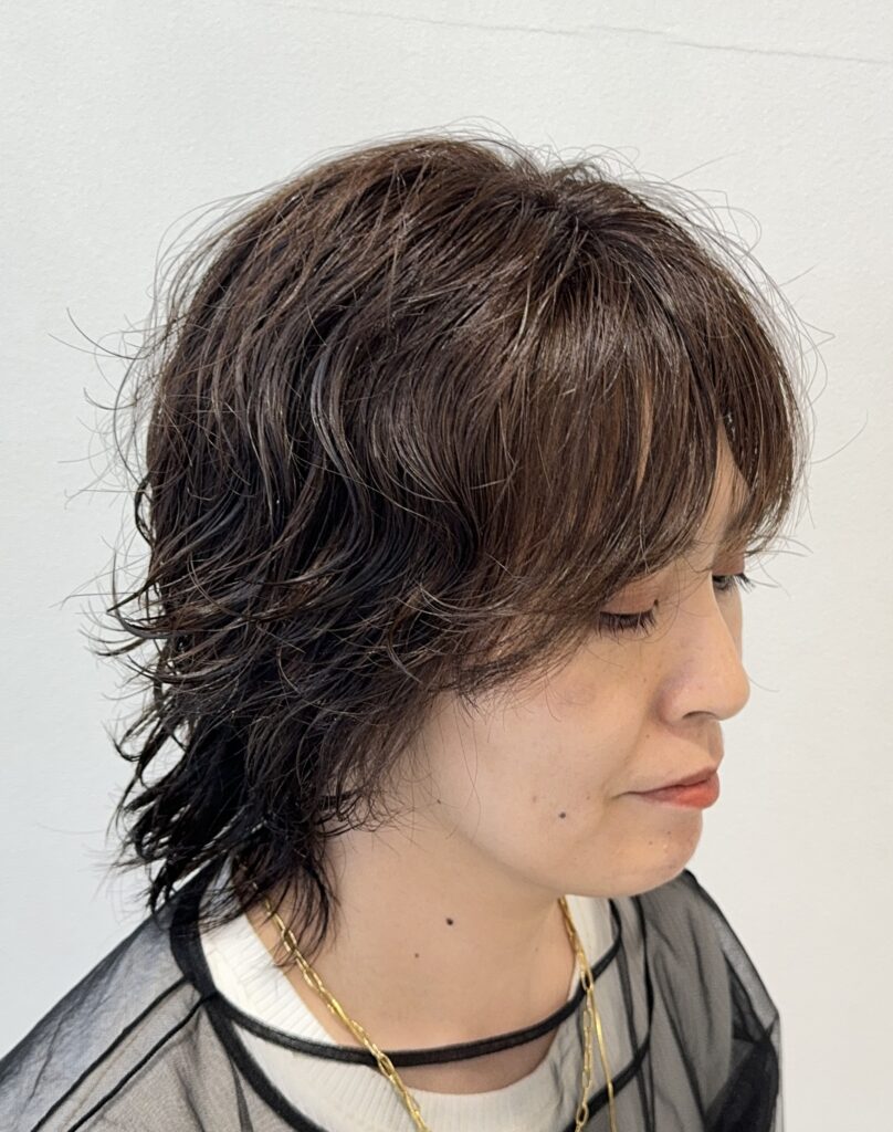 約1年でマッシュウルフ→ミディアムパーマ→セミロング→ショートパーマの順に変化。