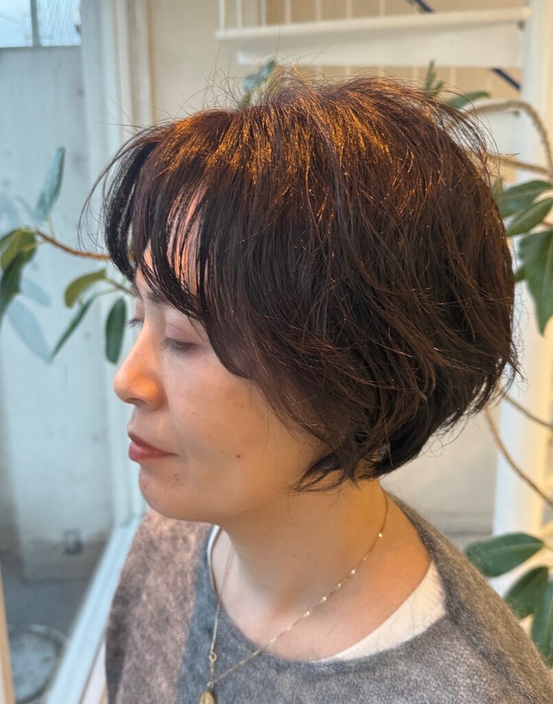 出てきだちな赤みを消すシルバーを入れてくすみブラウンにしてもらいました。春に着たい暖色系のお洋服にもマッチしそう。艶も復活ーーー!