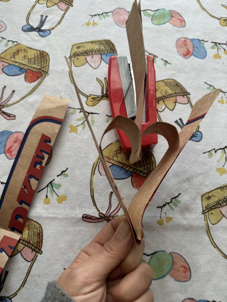 上側の短冊を折り下げて次の短冊と一緒にホチキスでパチン