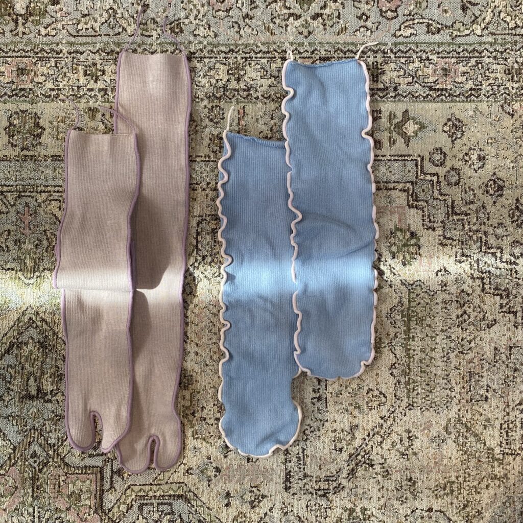 そして、つい最近タビ用のグレージュ×パープルソックスを追加しました!こちらは水色に比べて薄手なので、もう少し暖かくなってからの出番になりそう。