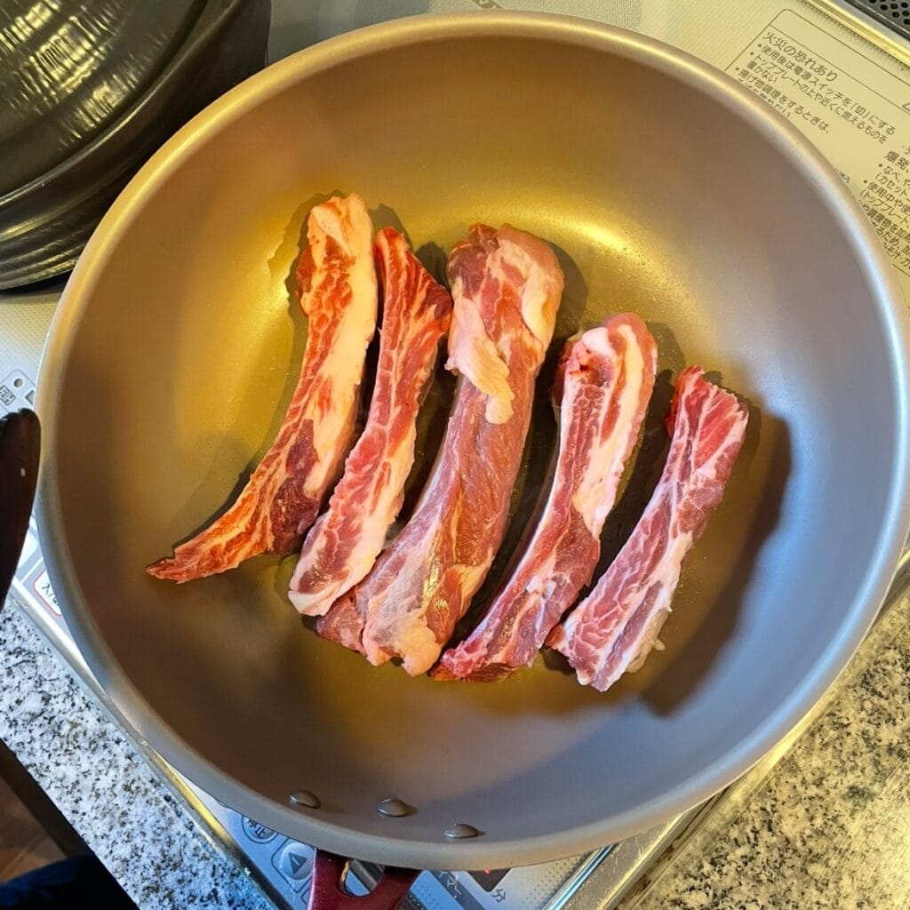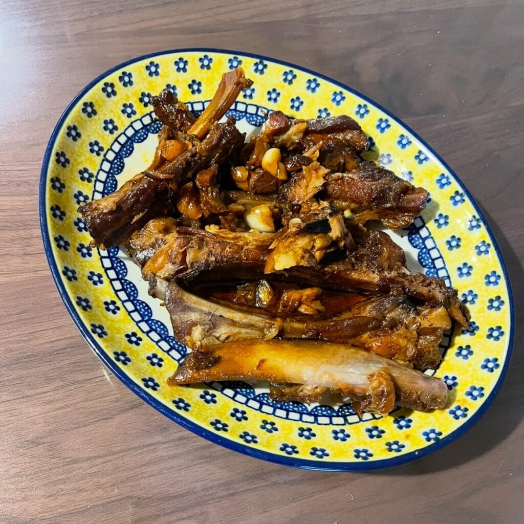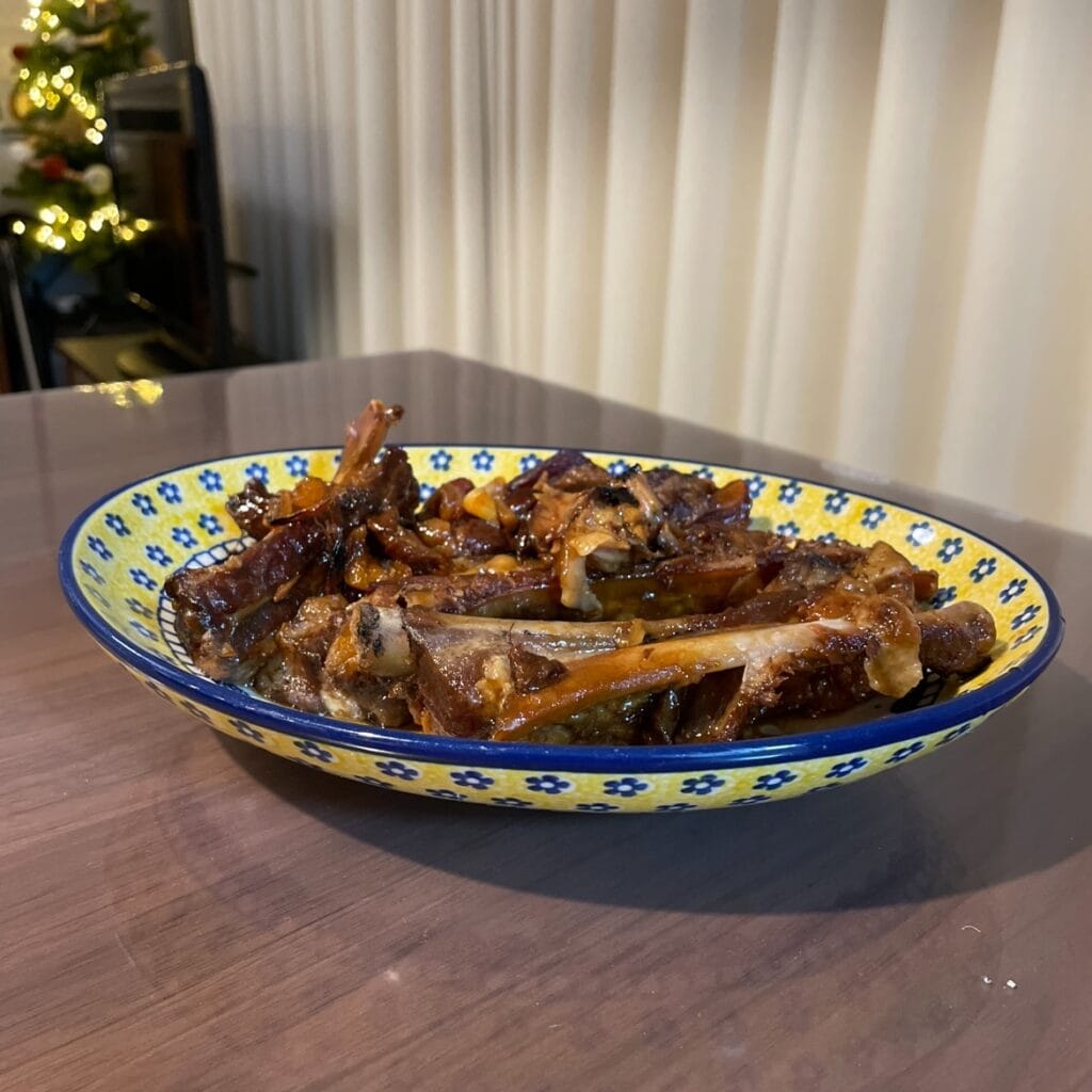 毎週土曜日の朝、スーパー開店時刻に合わせ長男(6歳)と買い出しに出かけるのがルーティンとなっている夫。一週間分の食材を買い込んで帰ってきます。先日は帰ってきてそのまま夕食の仕込みを始めました。コトコトと煮込むこと数時間…出来上がったのがこちら!醤油やみりんで味付けしたスペアリブ(骨付き豚肉)です。