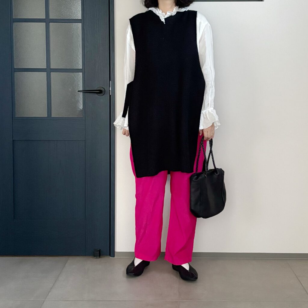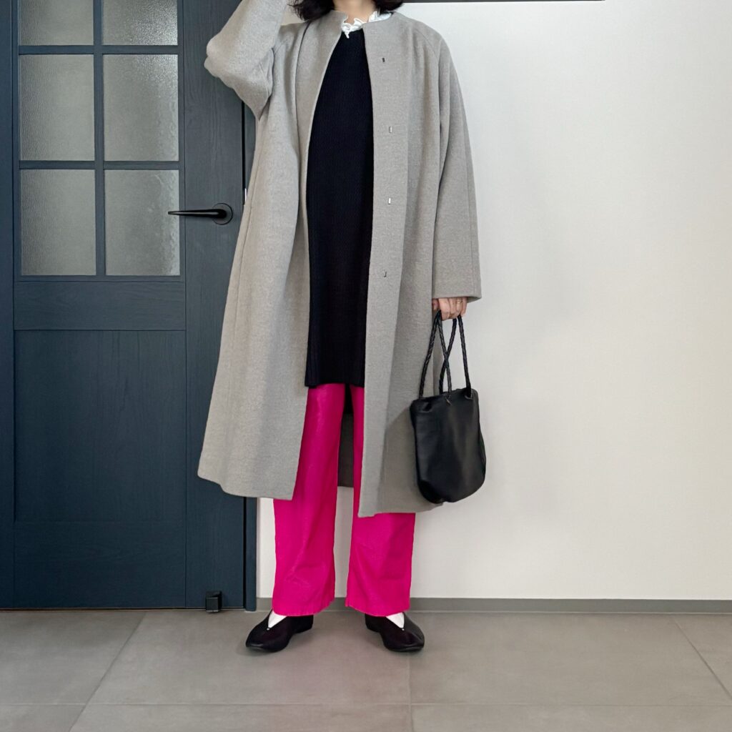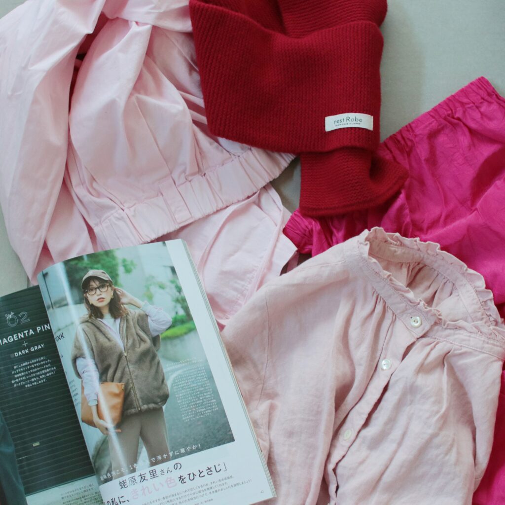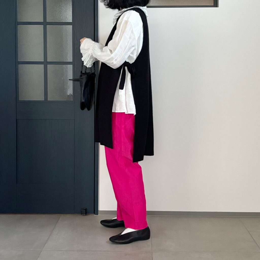 マゼンダピンクのパンツ!数年前に購入したyuniのものなのですが、主張強めのカラーなので目立ちすぎないように、ワンピースの裾からちらりと覗かせたり、チュニック丈のトップスと合わせたり。