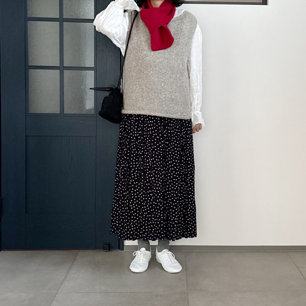 両サイドで結ぶデザインがかわいいベストは、midiumiのもの。こちらも数年前に購入したのですが、パンツは勿論、長め丈のワンピースやスカートとも意外と合わせやすくて重宝しています。