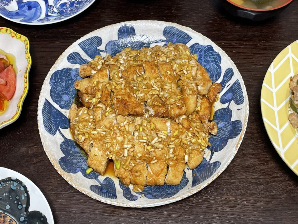 次男(小5)リクエストで作りました。「俺、ネギ嫌い」と普段から言っている次男も、「このネギは食べられるから作って!また食べたい!」と。鶏むねを一気に揚げて後からカットするので、唐揚げよりも断然時短です!!