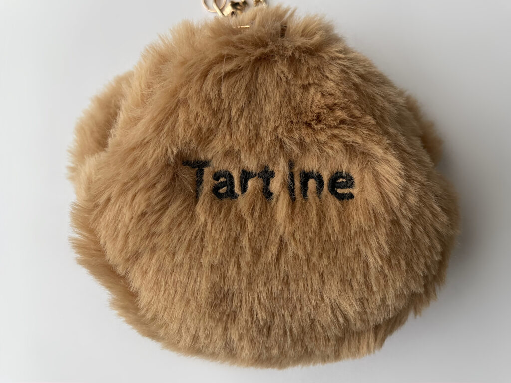 それから、タルティンシェル型ポーチも♡ タルティン(ストロベリー)とタルティン(プラリネチョコ)が1個ずつ入っています。ポーチの表側はタルティン姉妹のイラストで…、
