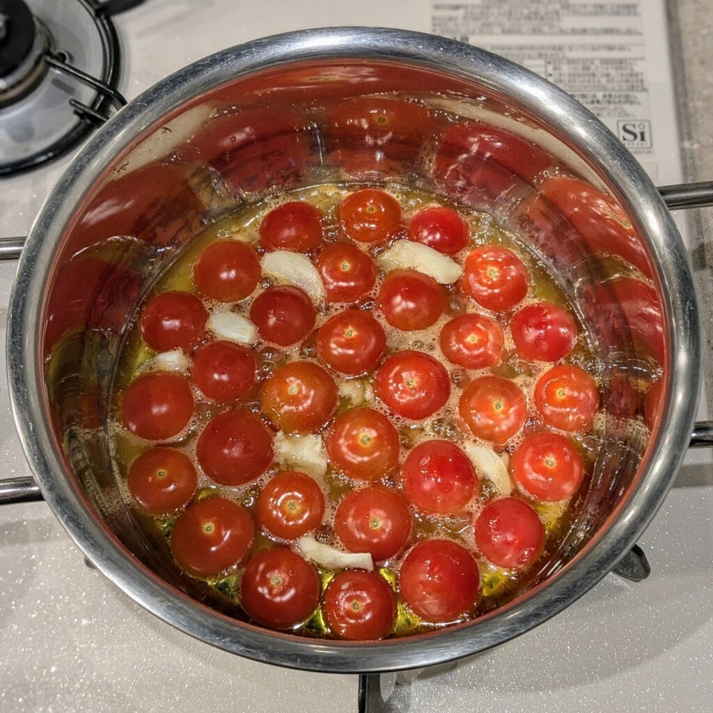 ソースを作る工程で、オリーブオイルにミニトマトを加えてから火をつけるという方法に目から鱗が落ちました。油が跳ねるのを防ぐことができて、熱が入っていくのと同時に自然とオイルが乳化されていきます。