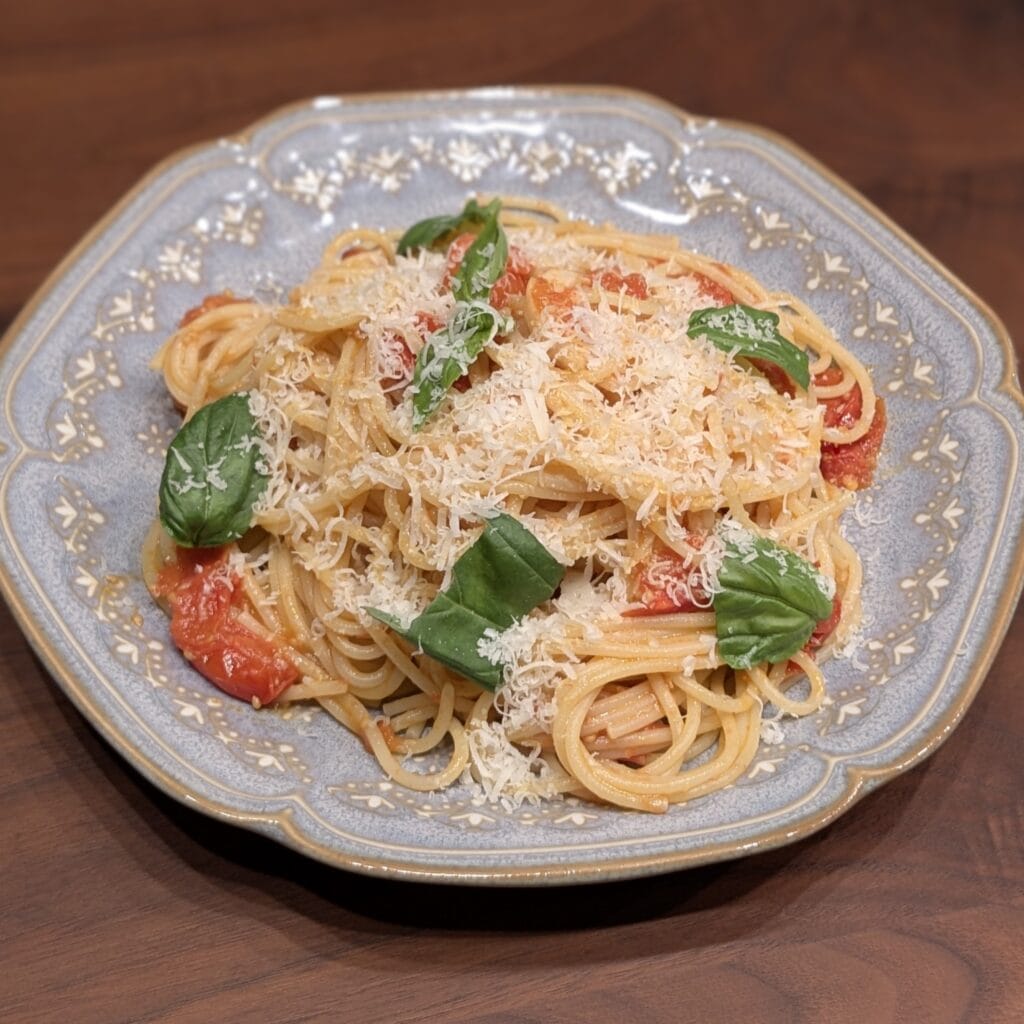 出来上がりは、パスタ版マルゲリータの様相。シンプルに素材の味を楽しめるパスタです。プチトマトはオリーブオイルと馴染んで酸味が少し和らぎ、甘みが少し増した感じ。そこにチーズの旨味がじんわりと溶けています。