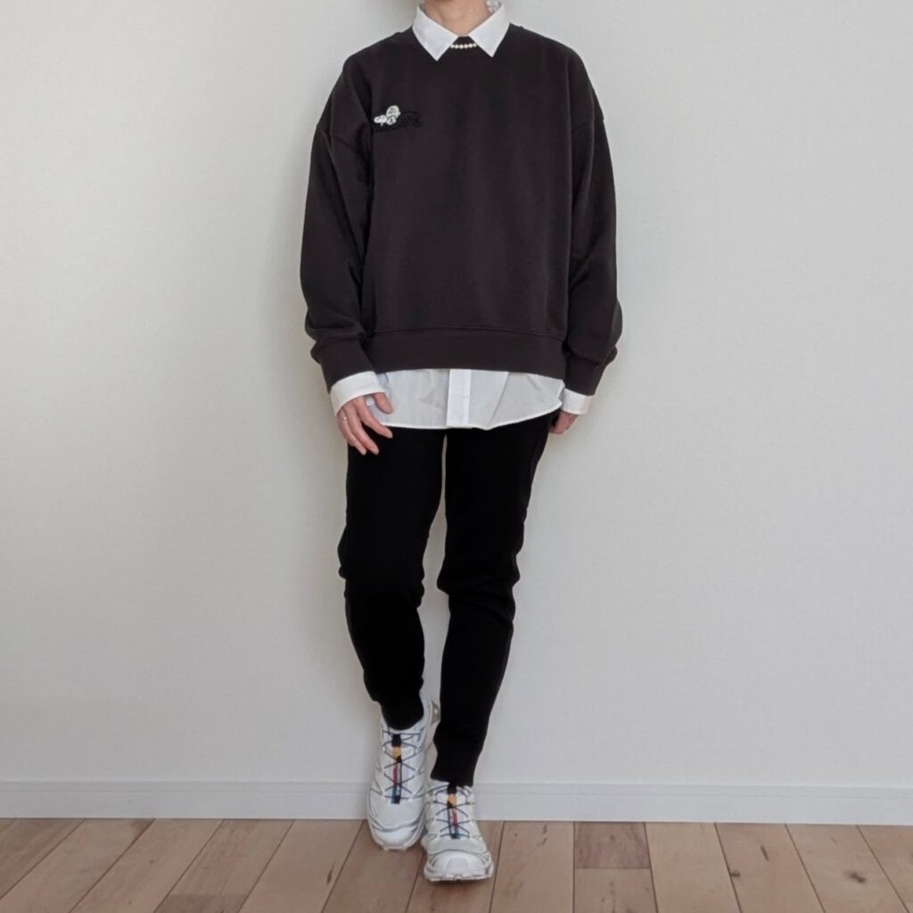 カジュアルなスウェットの上下も、きりっと締まります。フロントのカラーがモノトーンコーデのアクセントになっています。