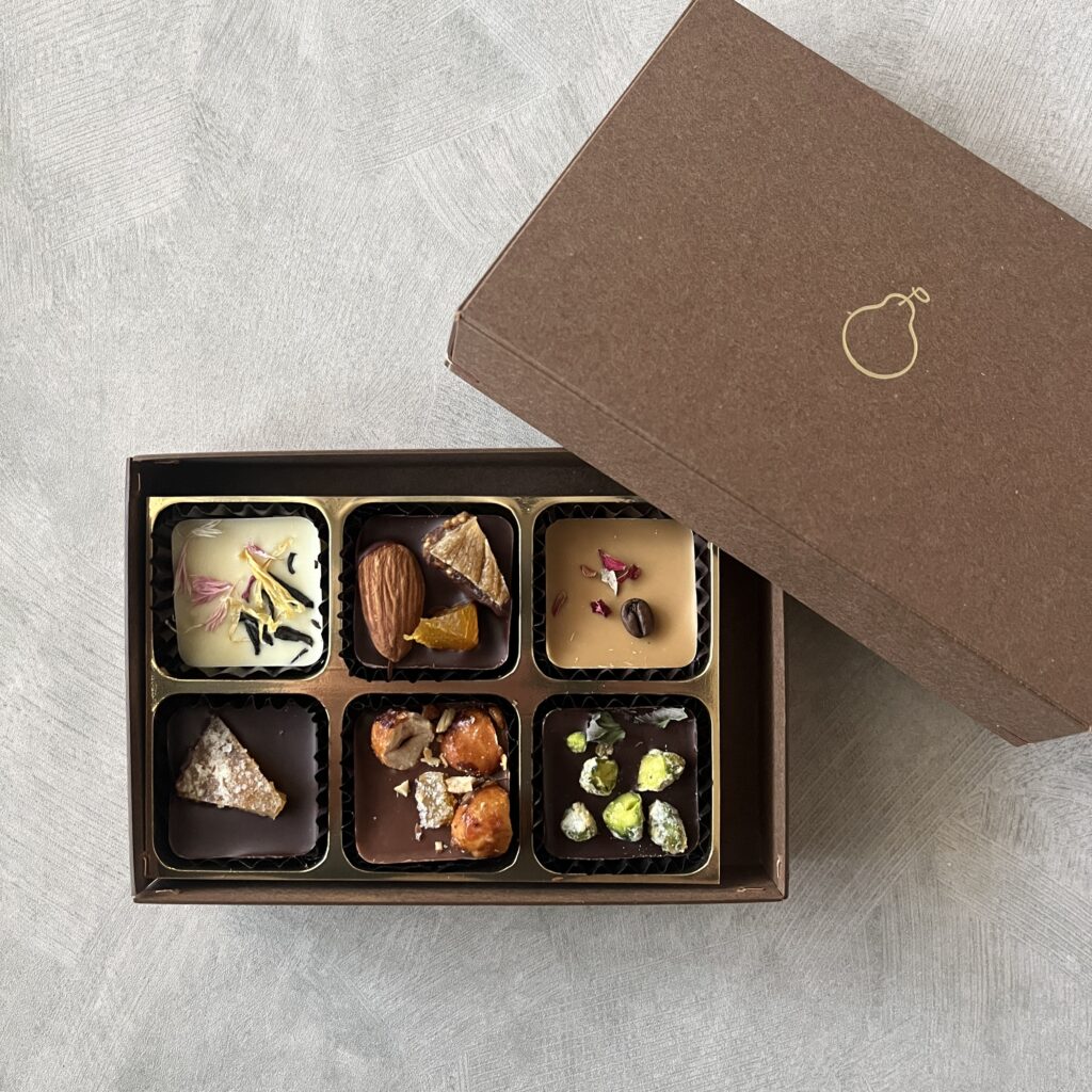 チョコレートのなめらかな口どけに、ナッツの香ばしさやフルーツの甘酸っぱさが重なり、ひとくちごとに違う味わいを楽しめます。