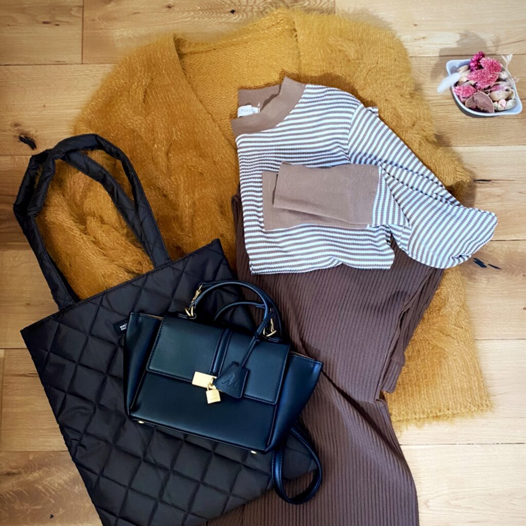 濃いブラウンのパンツにマスタード色のカーディガンを合わせて、同系色で揃えてみました!あとはアクセサリーでキラキラ感をプラスして、スニーカーはこちらにもコンバースを合わせようかな?♡