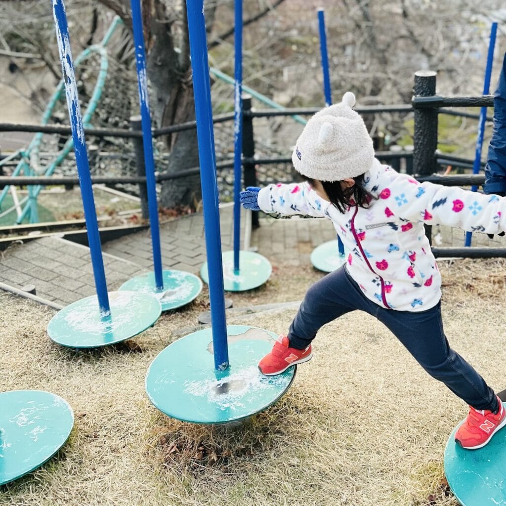 今回、雪遊びと同じくらい長女が楽しんでいたのがこちら。想像力をはたらかせながらコースを進む、知育型アスレチックです。