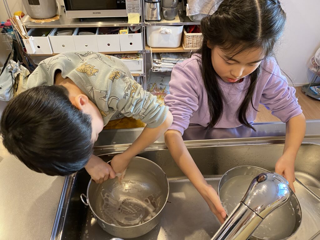 片付けまでするのがお菓子作り〜!「焼き上がりを待つまでに片付け」と口出しします(←また)