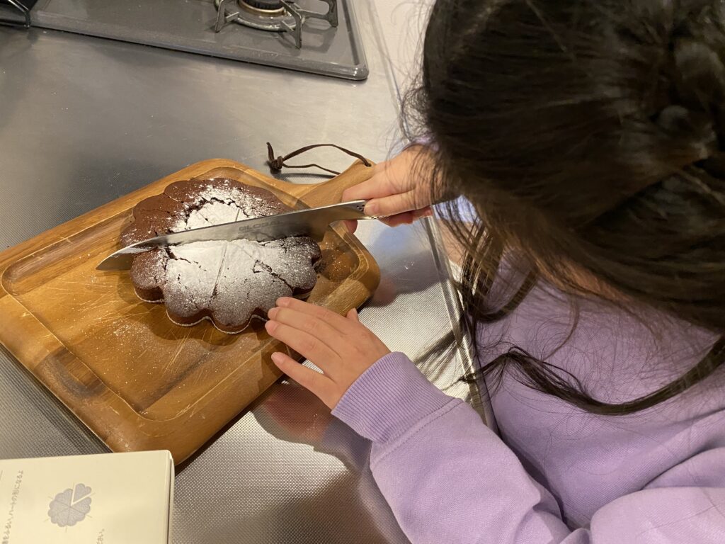 焼き上がったら、カット!粉砂糖が大雪のように降り積もりました☃☃笑
