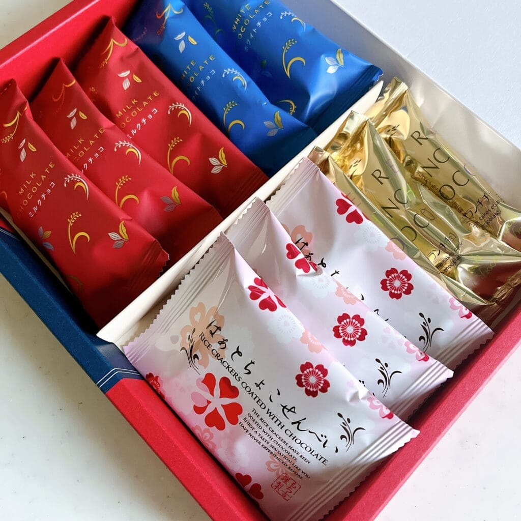 チョコあられのミルクチョコとホワイトチョコ、あられクランチチョコとはぁとちょこせんべいが全部で12袋入っています。