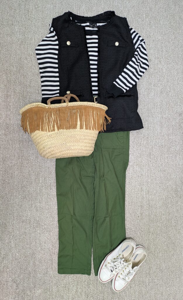 P29 カーキ色のパンツとカゴバッグがかわいいのでこちらを参考に!