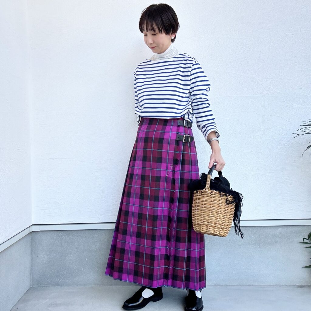 柄×柄の自分らしいコーデに。チェックと合わせてトラディショナルな雰囲気に。