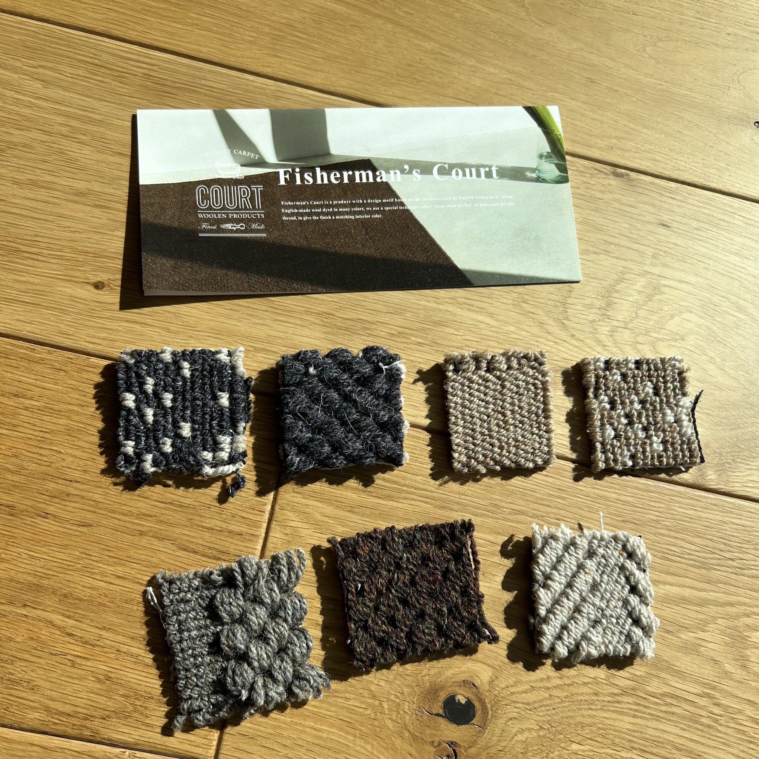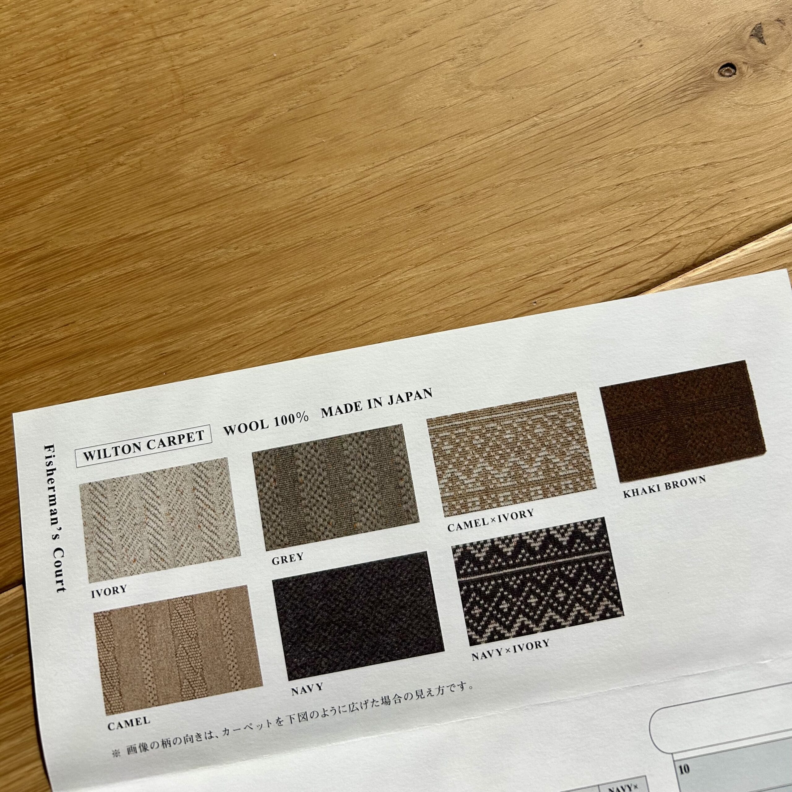 堀田カーペットのCOURTの中から今回購入したのが「FISHERMAN’S COURT」。英国の漁師が着ていたフィッシャーマンセーターをデザインモチーフにした商品なのだとか。カラーは現在7色。それぞれの色で織り方が違っているのも面白い!サイズは一番小さくて600mm×400mmから、大きなものは2000mm×3000mmまで、全部で10種類あります。敷きたい場所に合わせてカラーもサイズも選べます。