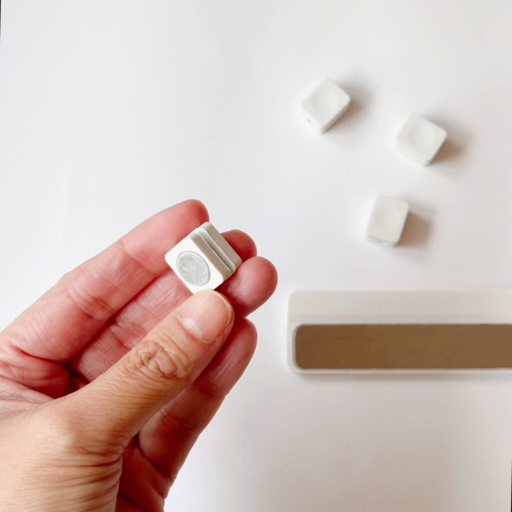 中には、表が金属板、裏側には粘着テープのついた本体と、小さなパーツが4つ入っています。