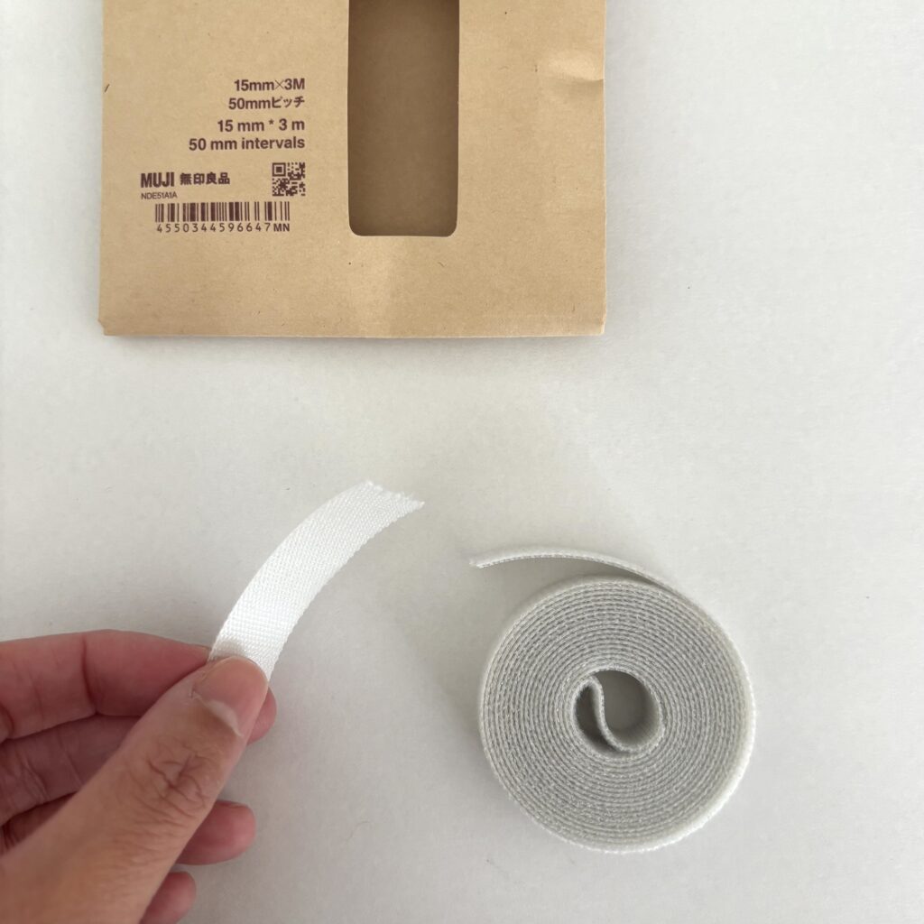 扇風機などクローゼットにしまっている季節家電のコード、テレビ裏の長すぎるコード、たまにしか使わないケーブルなどをこの結束テープでまとめています。