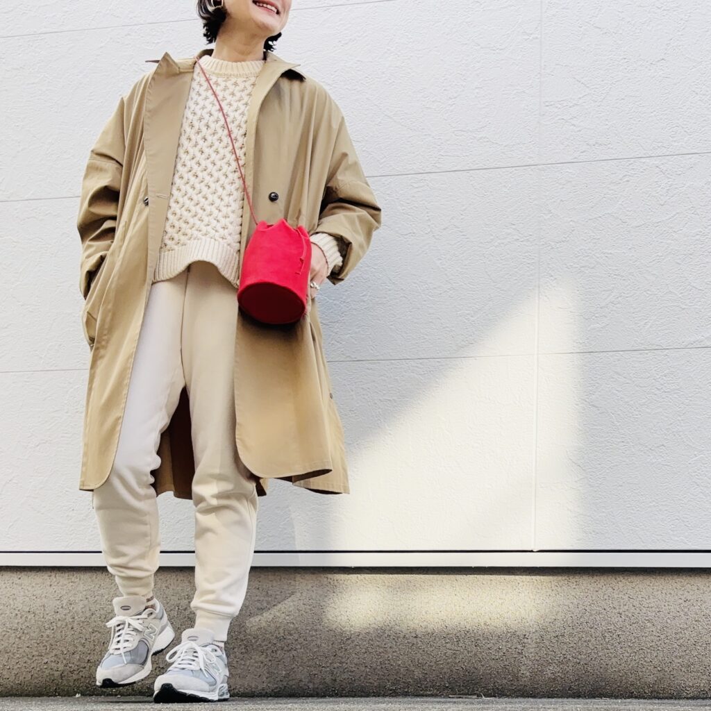 何年も愛用しているteori worksの巾着バッグとは全然印象が違うので、同じ差し色でも新鮮に合わせられます。