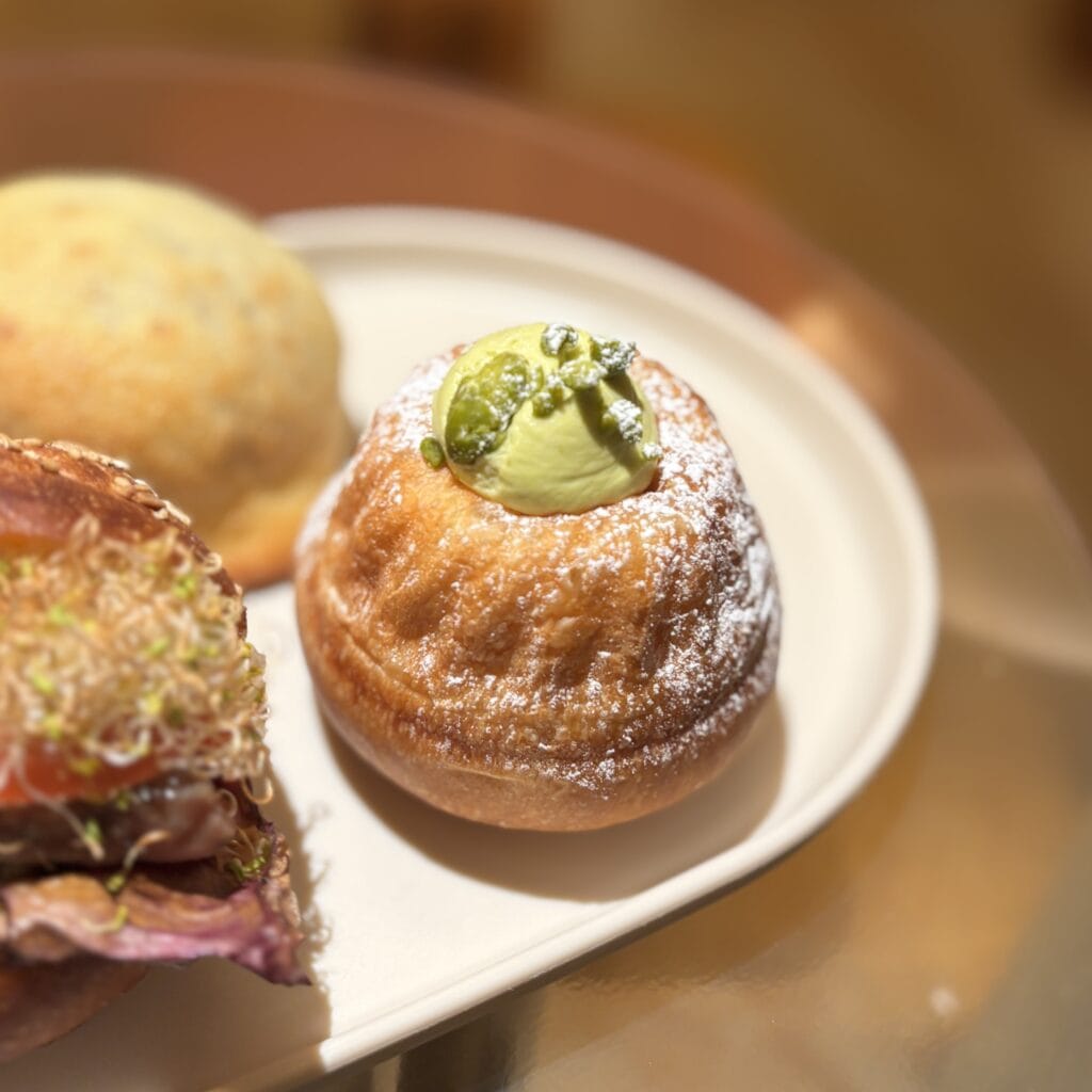 中には自家製カスタードと濃厚ピスタチオクリームがたっぷり詰まっています。