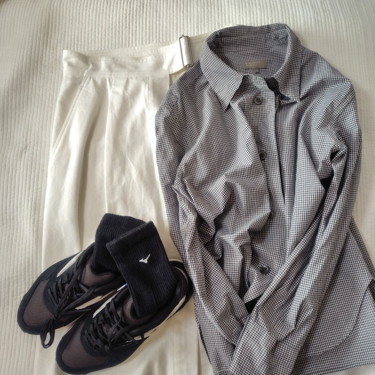 お気に入りのブラウスと合せて、もう少し先の季節をイメージ。スニーカーが落ち着いたカラーなので喧嘩せず、合わせやすい!