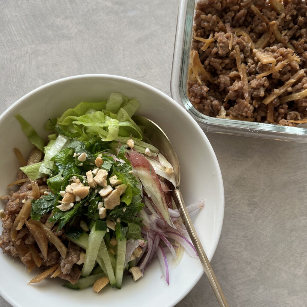 甘辛く味付けしたミンチに千切り生姜がほどよいアクセントに。