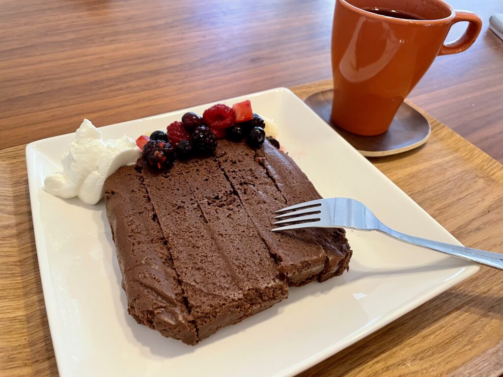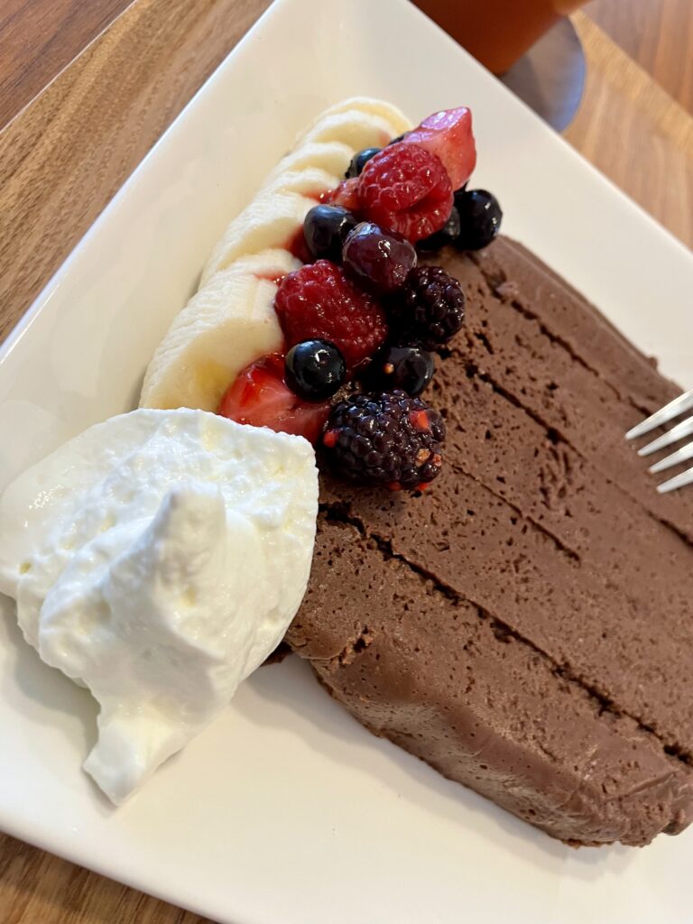 いつもの好物ガトーココア。ギリシャヨーグルト、バナナ半分、ミックスベリーを添えます。