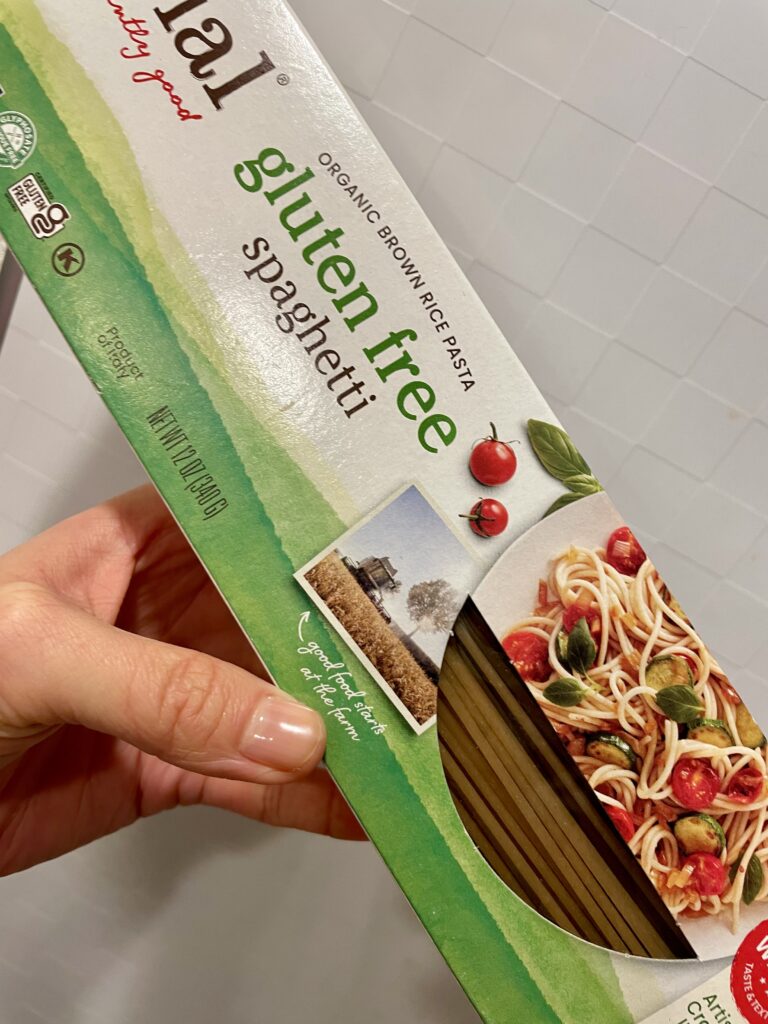 iHerbで購入した玄米のスパゲッティ。色はお蕎麦みたいなグレーがかった茶色で、美味しそうには見えませんが味は全く違和感なく食べられます。