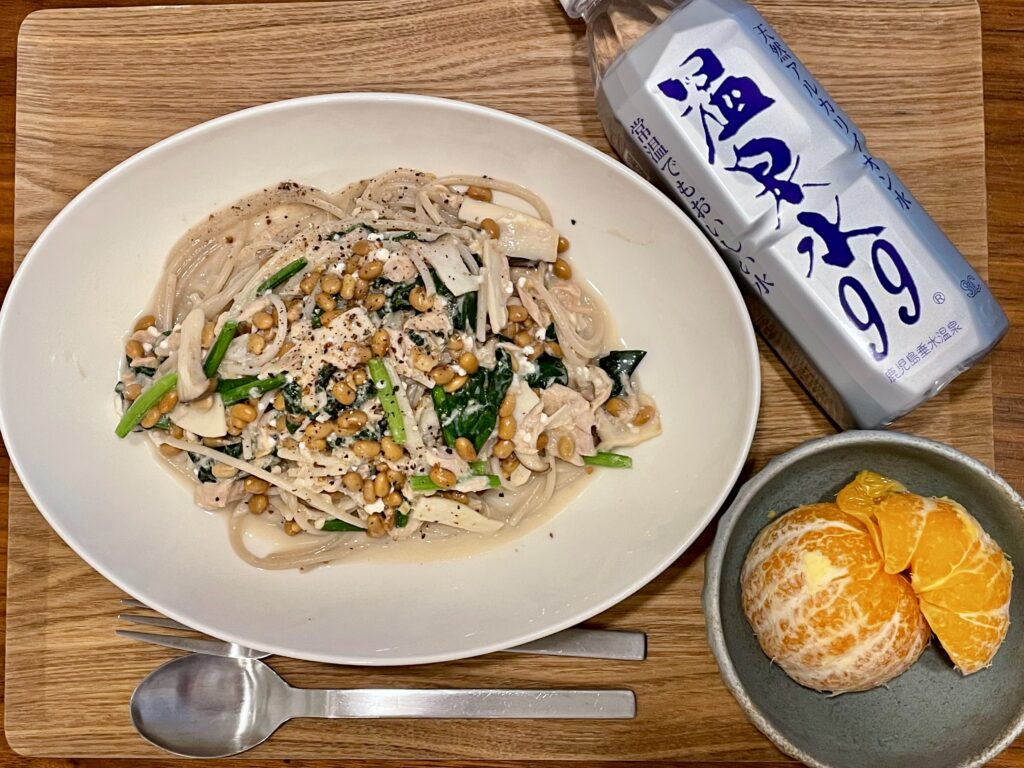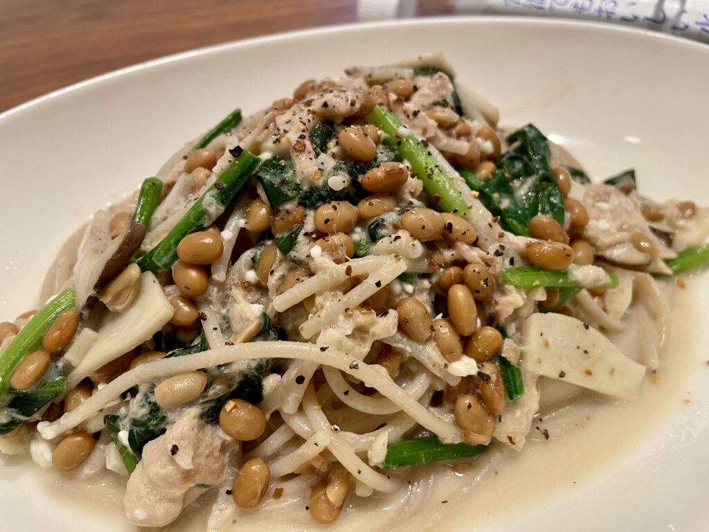クリームソースは、ほうれん草とエリンギ、ツナの水煮をアーモンドミルクとコンソメで煮てカッテージチーズを散らしました。なんとなく思いつきで最後に納豆も投入!
