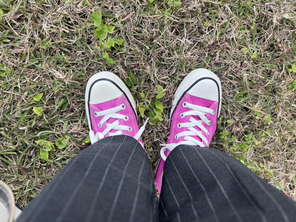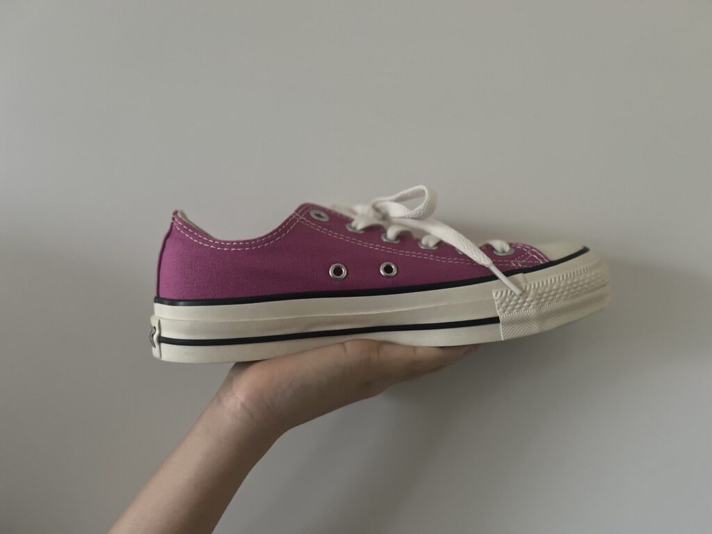 去った年末、ぷらぷらお買い物中に以前から気になっていたピンク色のコンバースを見つけました。お値段を確認するとぐぐぐーっと下がってセール中。さてどうしよう。これは運命ですか?でも今まで挑戦した事の無い未知の恋色(ピンク)をどう履くの?挑戦するなら今なのかも!と自問自答を重ね正直な気持ちを模索。でもね真っ直ぐストレートに気持ちを整えると、悩んだ割にはすたすたレジに向かっていました(はい喜んでお買い上げ)。