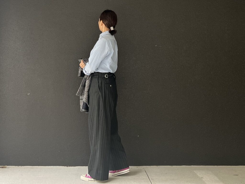 喜多編集長が当日スタジオで着ていたコーデが持つ機能性や利便性を兼ねたアイデアに釘付け。図々しくも手持ち服と新しいピンクスニーカーを使って限りなくオマージュ(真似っこコーデ)してみました。