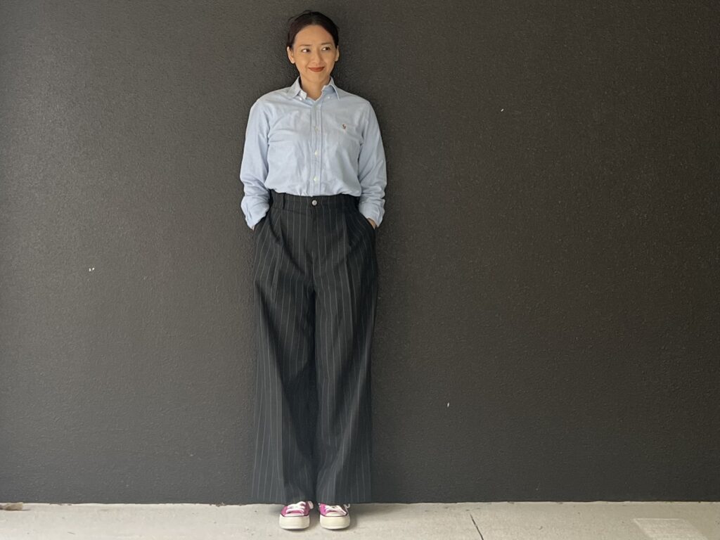 普通ならシャツにパンツを重ねると、当たり前のようにヒールやローファーを履いて仕事に行くという概念や常識の縛りにとらわれ大体既定路線の流れに沿ったコーデになりがち。でもおふたりが軽やかにそんなことあったかな?と思えるくらい、自然にピンクのスニーカーと合わせていて颯爽とそんな考えを乗り超え新しいコーデの在り方を見せたお姿がとてもかっこよかったです!
