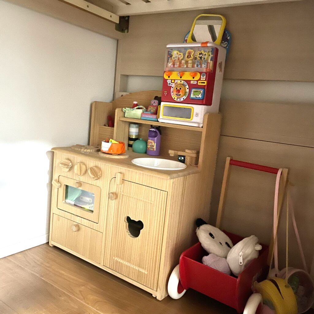 娘は反対側の壁沿いにお気に入りの木製キッチンを置いています。