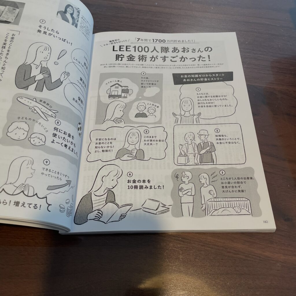そんなときに目にしたのが、182ページからの「LEE100人隊あおさんの貯金術がすごかった!」の特集です。実は我々夫婦、仕事柄ふたりともファイナンシャルプランナー資格を持っていますし、日経新聞も毎日読んでいて割とお金の知識はあるほうなのです。それでも、この特集は参考になることばかりでした。