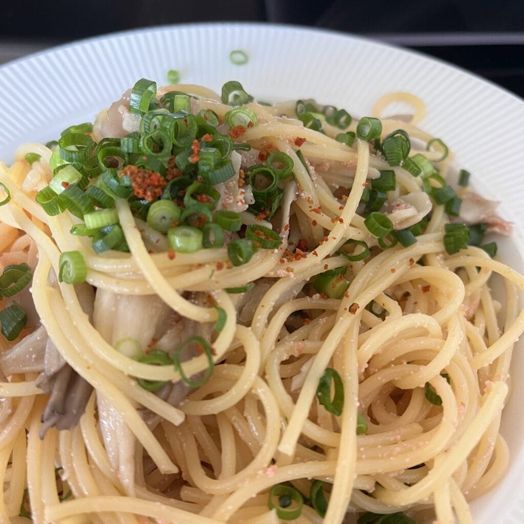 明太子と舞茸のパスタ。ゆずの香りがプラスされて幸せな味になります。