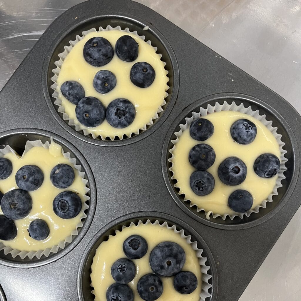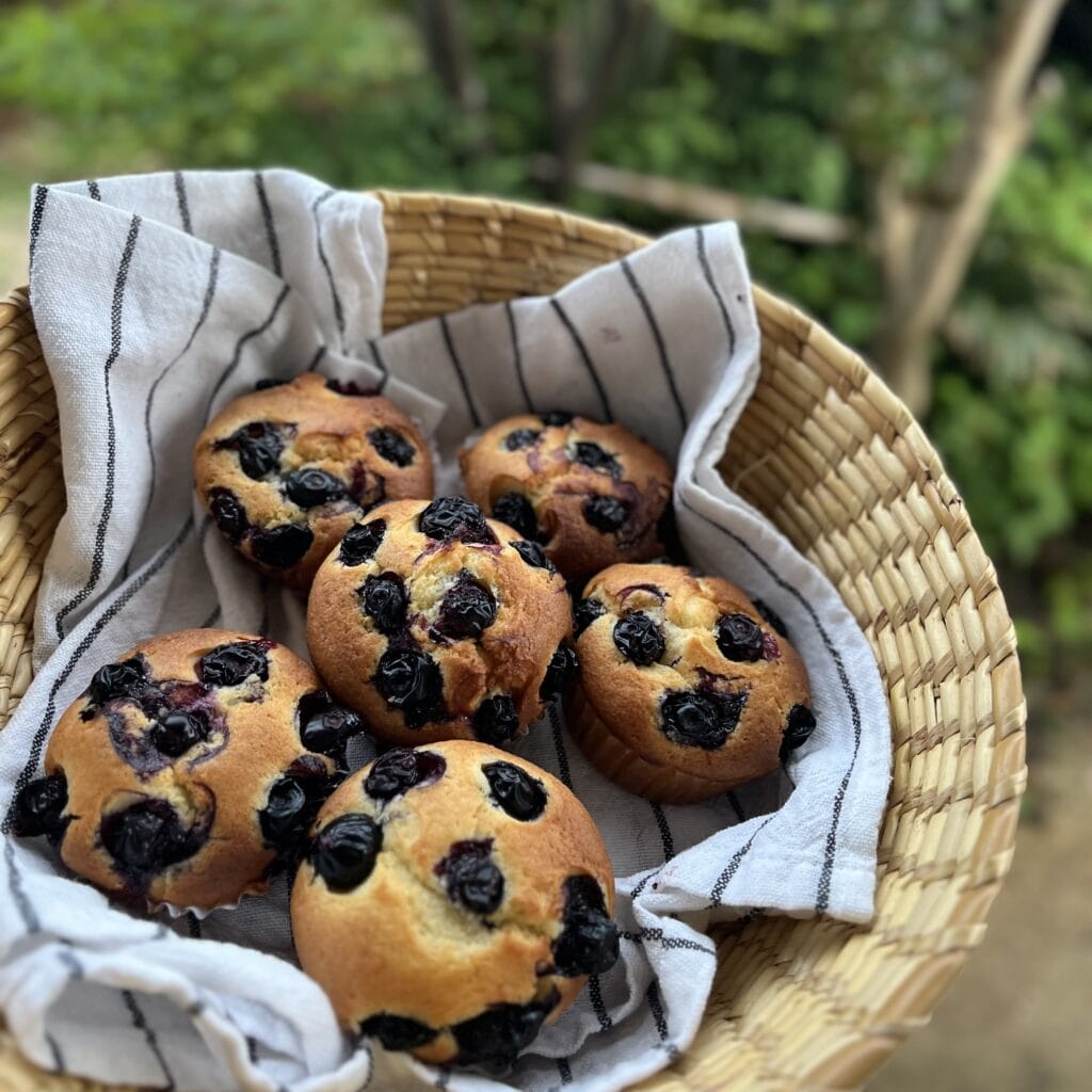 ブルーベリー狩りに行くくらいブルーベリー大好物なんです。ちょうど冷蔵庫に残ったブルーベリージャムがあったので、マフィンの中に忍ばせて、上から酸っぱかった生のブルーベリーをのせて焼きました。