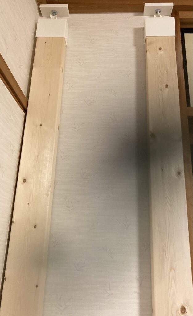 1.2×4材の上下にディアウォールを取り付け、壁に設置。
