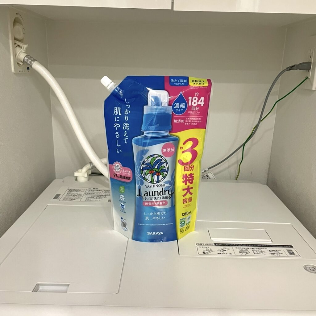 今まで、上の戸棚から洗濯洗剤を取り出して+洗濯物の量を洗濯機が測ってくれるのを少し待って+洗剤を測っていれて+洗濯洗剤を戸棚に戻すという合計4工程を毎回やっていたのですが、それから開放されるって地味に大きいです。