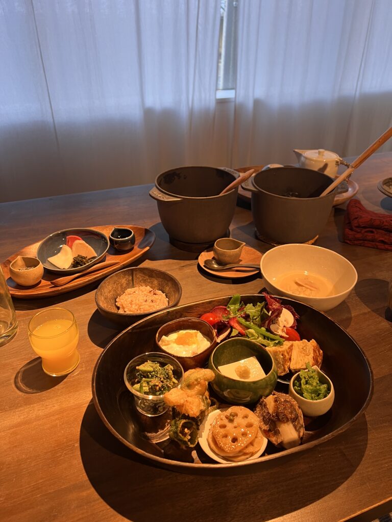 事前に白米、玄米、おかゆなどから主食を指定することができます。わたしは胃もたれ防止のためw「玄米粥」をチョイス。指定した時間になると、料理してくれた女性みずから部屋の前に朝食を運んでくださいます。部屋食なのでゆっくり味わえて本当にありがたい。