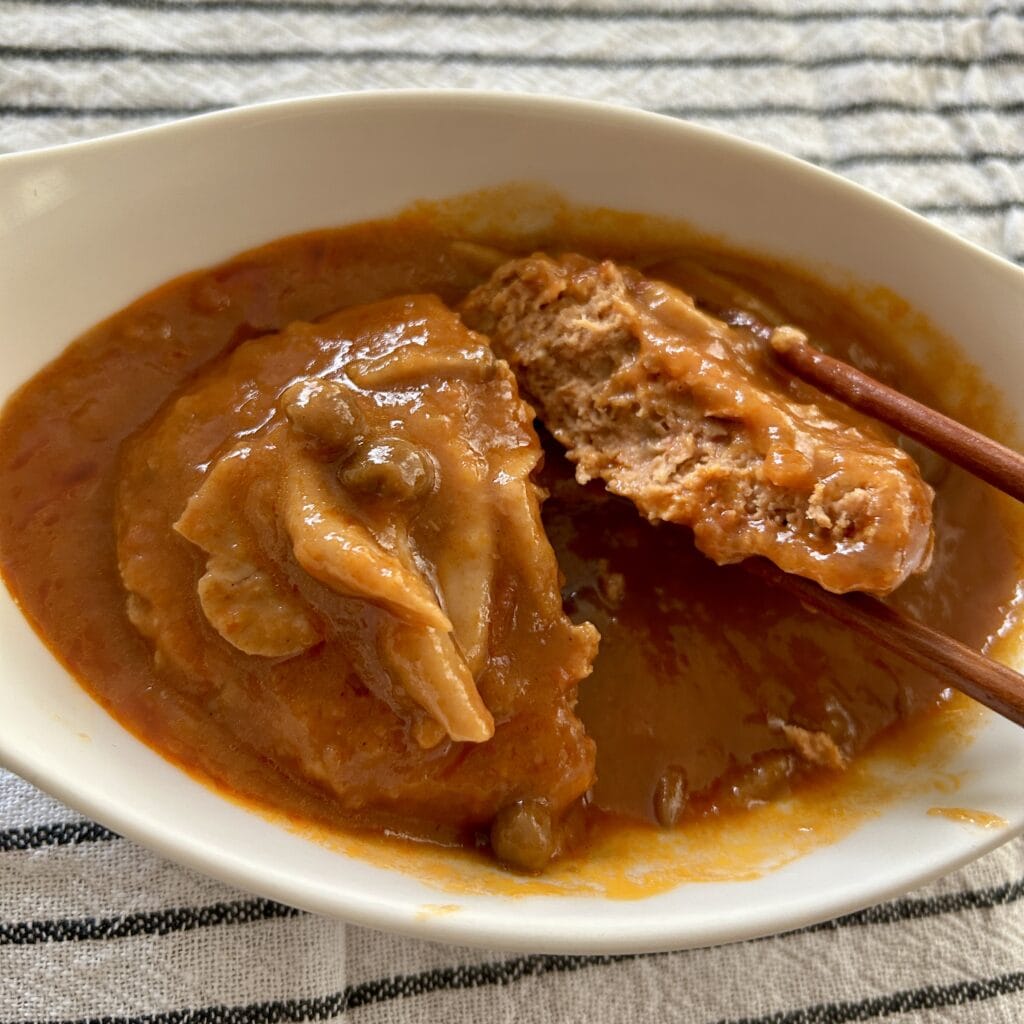 しめじとマッシュルームがたくさん入ったトマトベースのソースだから子どもから大人まで食べやすいです。非常時だからこそ食べたいメニューの一つじゃないかなと思ってのハンバーグ。