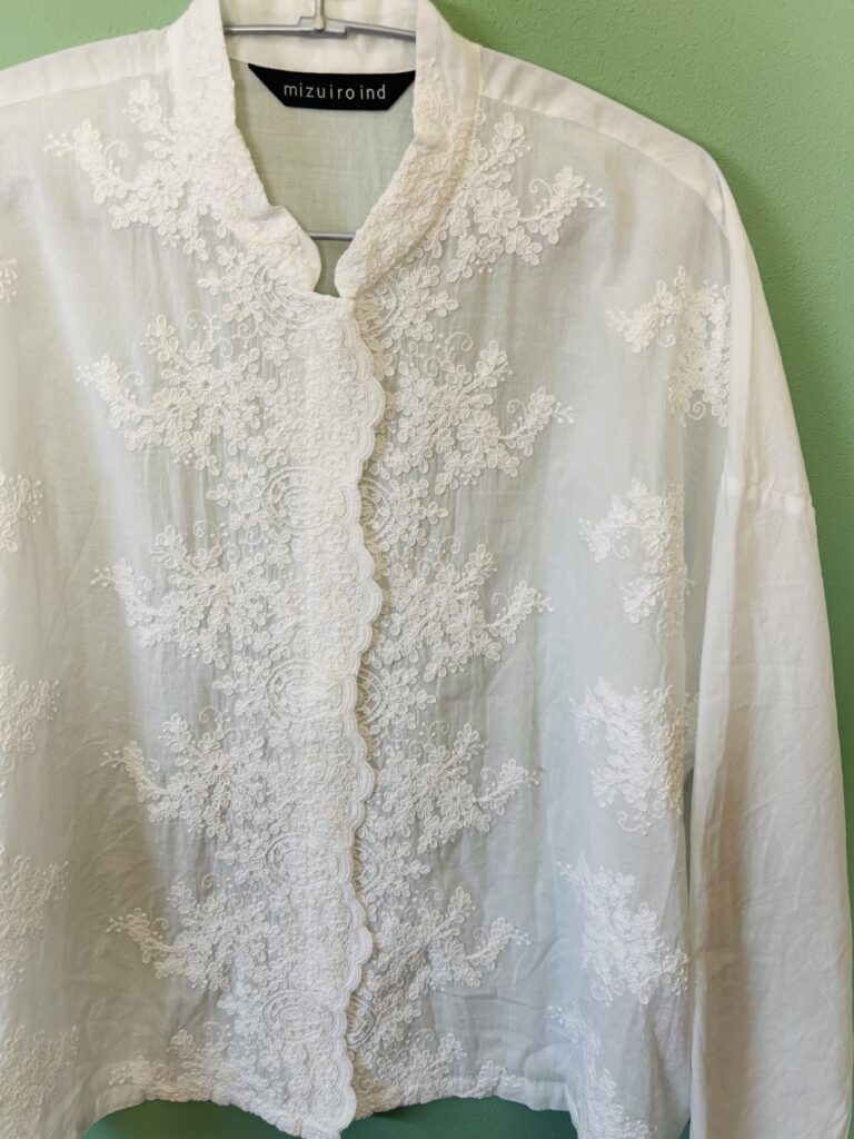 1年前くらい買ったものですが、ちょうどジャケットの前部分から見える所の刺繍が華やかなのでブラックのセットアップだけでは足りない華やかさを足してくれるかなぁと。