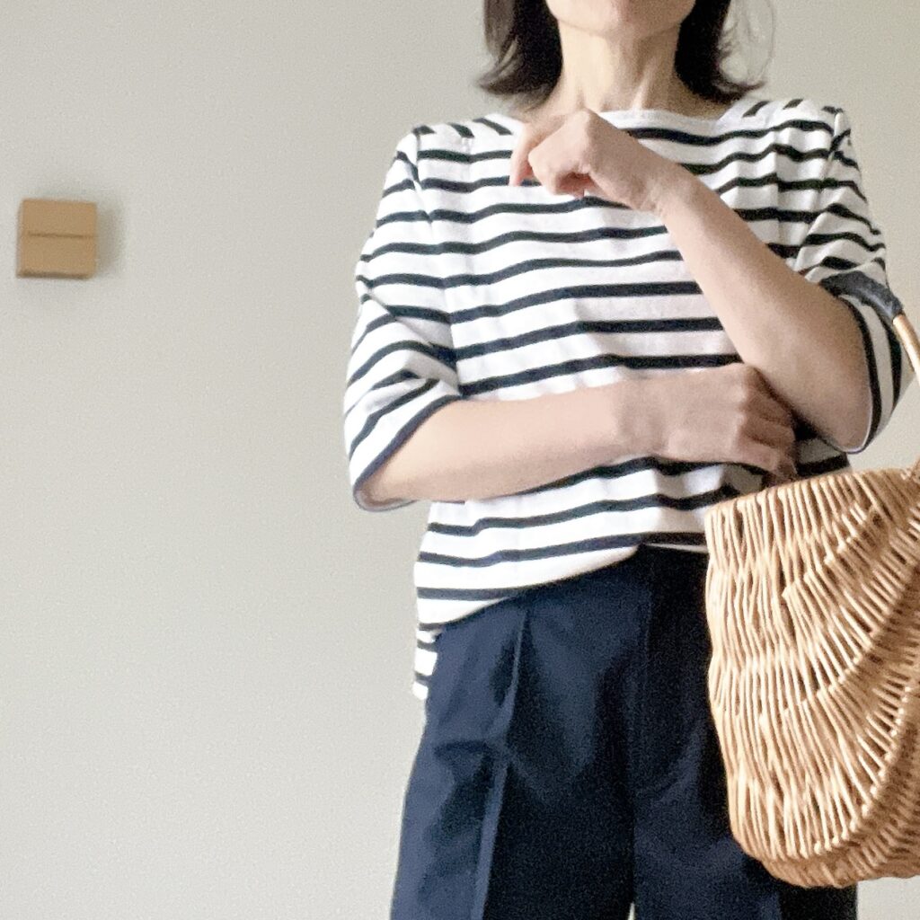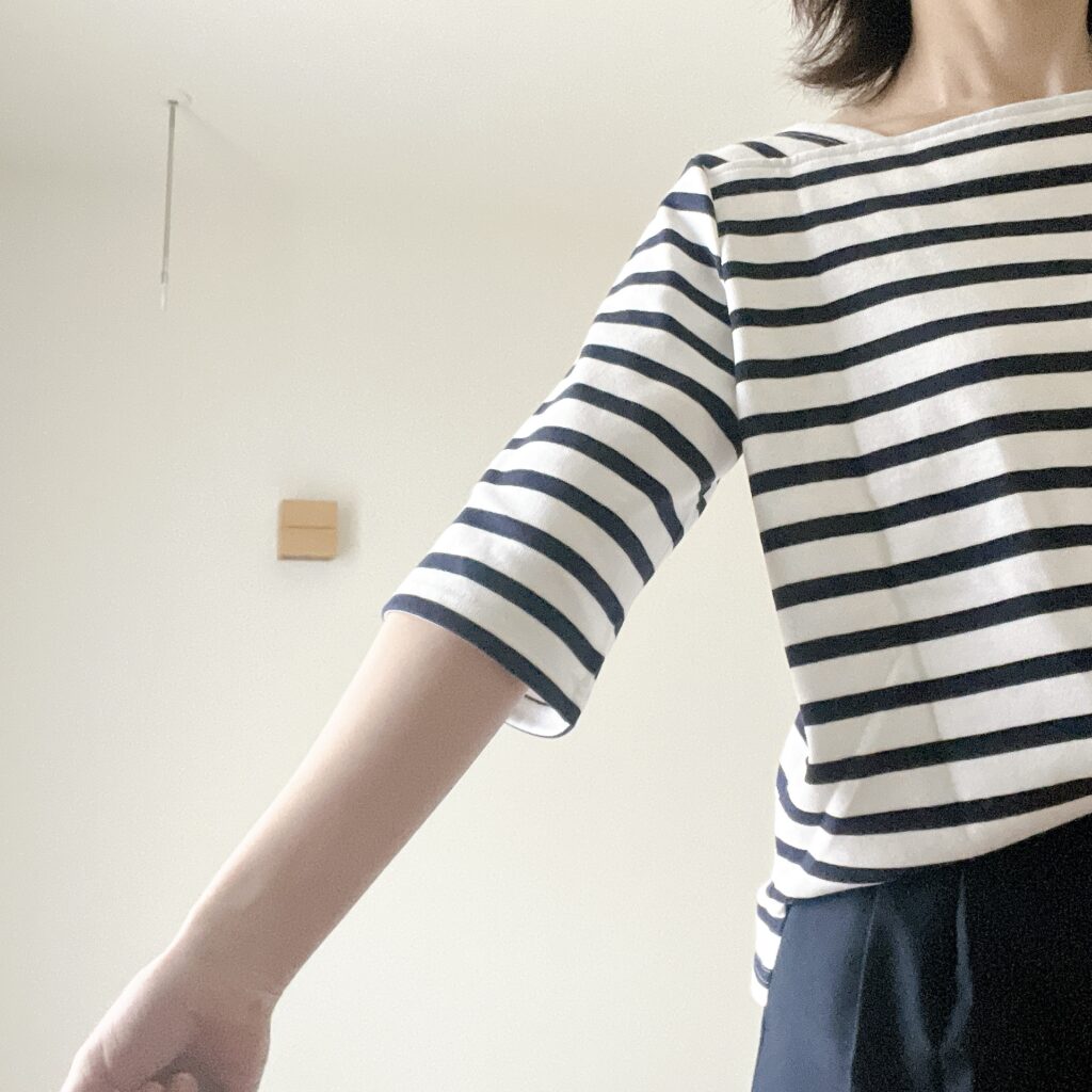 女性らしいスクエアネックは、深めと浅めのどちらを前後にしてもOKとのことで、カジュアルなボーダーも女性らしく着こなすことができると思いました。ちなみに私は後ろが広くあくように浅めを前にきています。