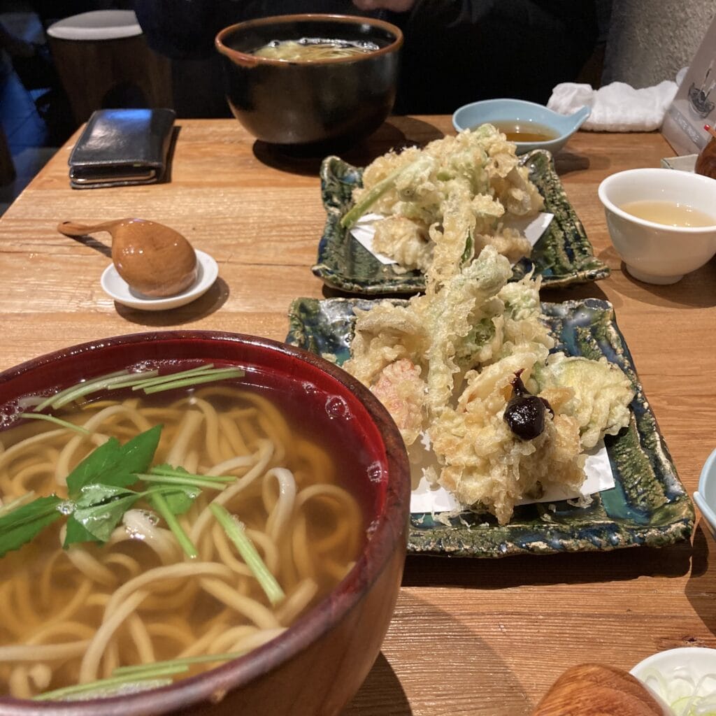 夫も私も季節の山菜天ぷらのついたかけ蕎麦を。