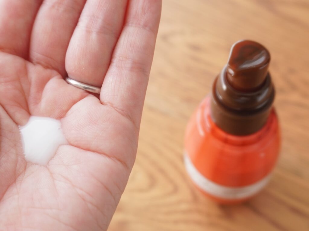 タオルドライ後に適量を手に取り、毛先を中心になじませて髪全体にも。わたしは髪の毛が多いので2〜3プッシュ使用しています。