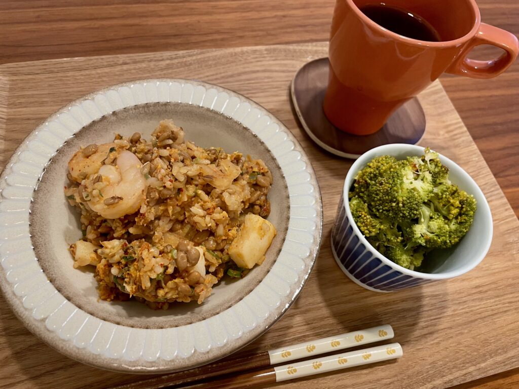 日曜日のお昼ご飯は簡単に済ませたくて、冷凍のシーフードミックス、納豆、キムチで炒飯にしました。