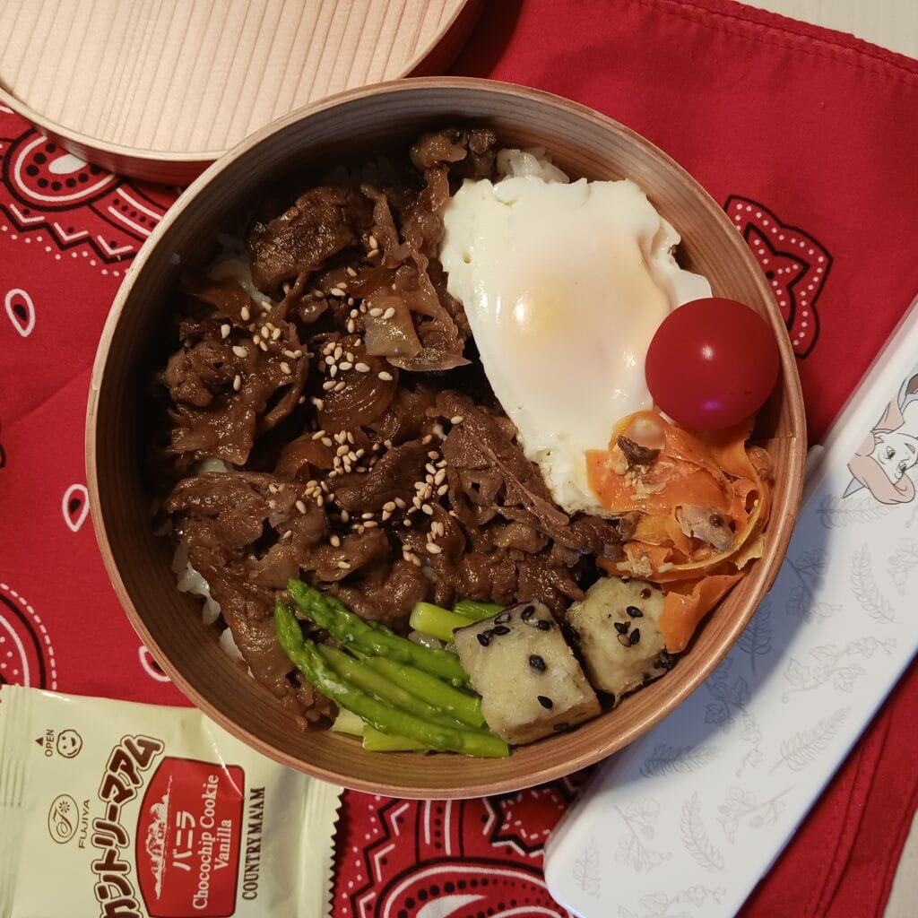 牛丼、目玉焼き、さつまいも、人参サラダ、アスパラ